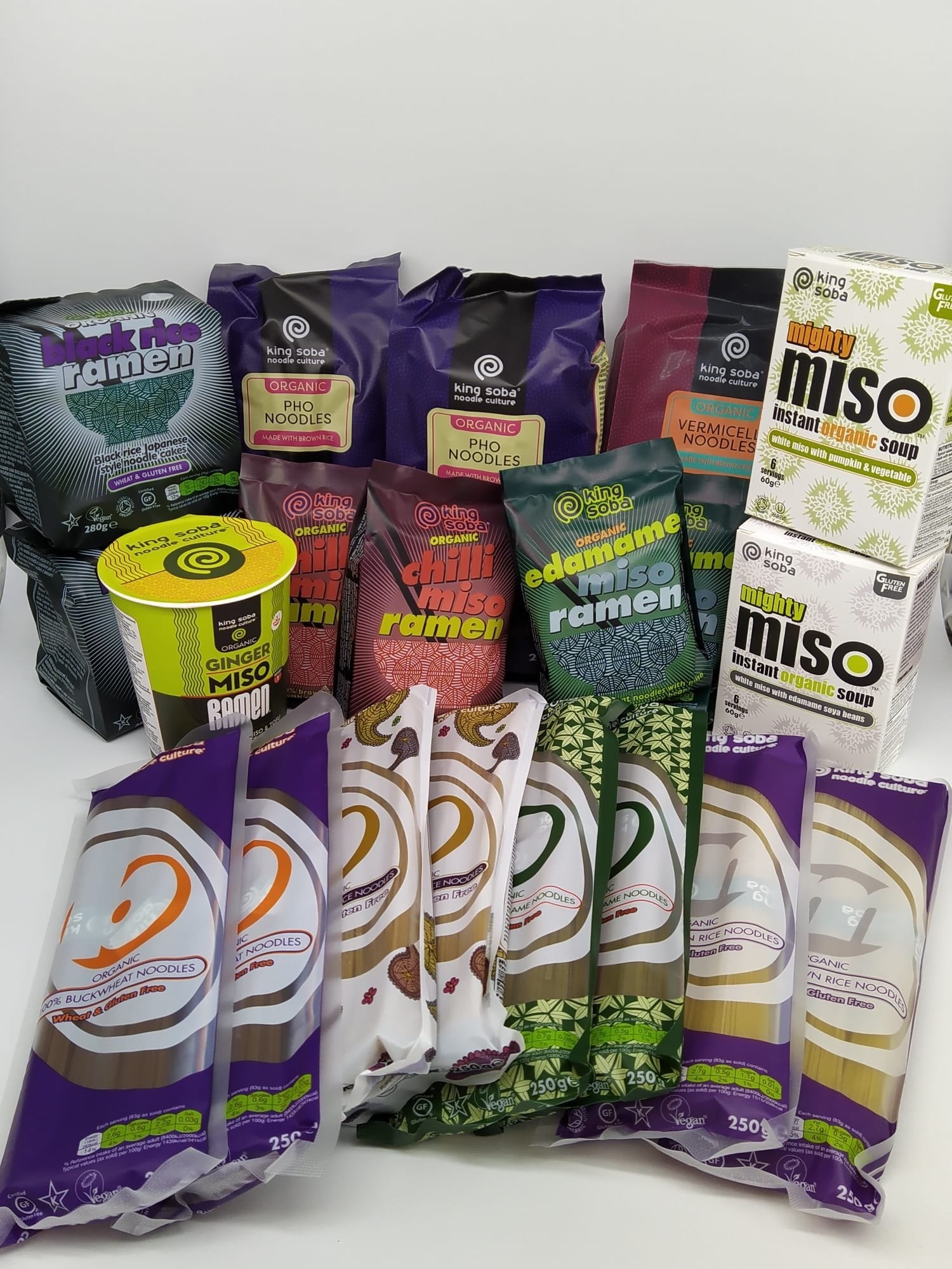 Eine Tasche mit 20 Noodle-Produkten von King Soba, das Haltbarkeitsdatum der Produkte ist 6-2023. Die Produkte sind von ausgezeichneter Qualität und sogar noch monatelang haltbar.
